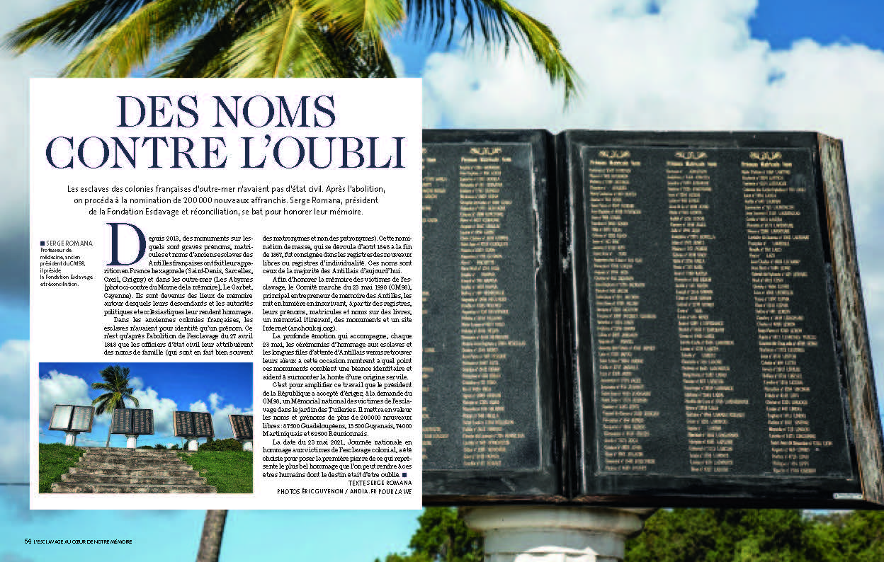 C’est pour amplifier ce travail que le président de la République a accepté d’ériger, à la demande du CM98, un Mémorial national des victimes de l’esclavage dans le jardin des Tuileries. Il mettra en valeur les noms et prénoms de plus de 200000 nouveaux libres : 87500 Guadeloupéens, 13500 Guyanais, 74000 Martiniquais et 62500 Réunionnais. La date du 23 mai 2021, Journée nationale en hommage aux victimes de l’esclavage colonial, a été choisie pour poser la première pierre de ce qui représente le plus bel hommage que l’on peut rendre à ces êtres humains dont le destin était d’être oublié.[/fusion_text][/fusion_builder_column][/fusion_builder_row][/fusion_builder_container]